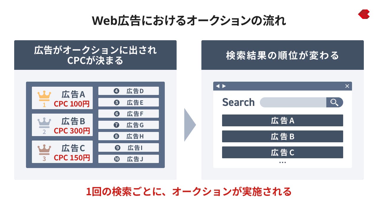 その背景には、オークション制という仕組みがあります。広告が表示されるたびに広告ランクと呼ばれる順位づけが行われ、その結果として表示位置やクリック単価が変わります。