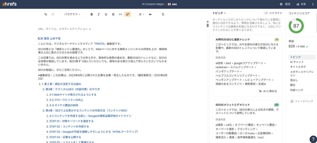 ページ全体のコンテンツスコアとページ内のトピック毎のスコアが算出されており、トピック毎に改善方法を提案してくれます。競合の引用されているコンテンツのスコアをベンチマークし改善することで、改善の方向性と程度がわかりやすくなります。