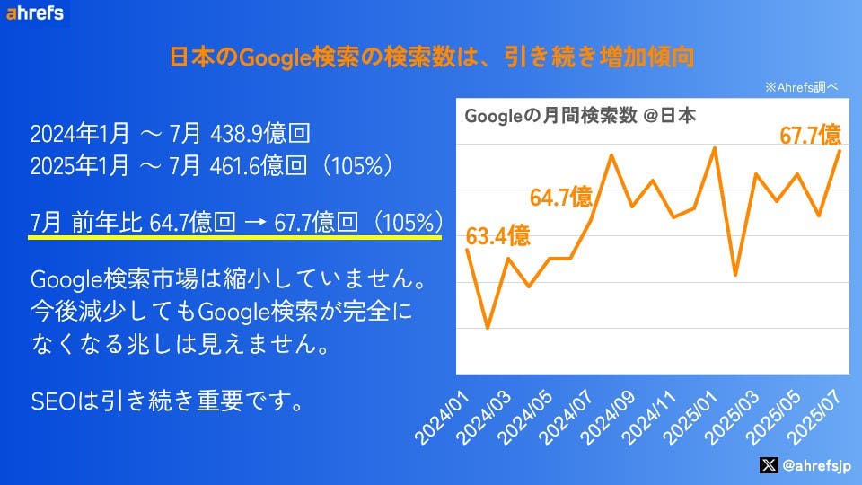 Ahrefsの調査によると、日本におけるGoogle検索の月間検索数は引き続き増加しています。