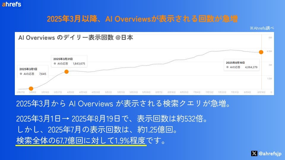 2025年3月のコアアップデートと同時期に、GoogleはAI OverviewsをGemini 2.0にアップデートしました。これにより、より多様な検索クエリでAI Overviewsが表示されるようになり、日本国内での表示回数は急増しています。