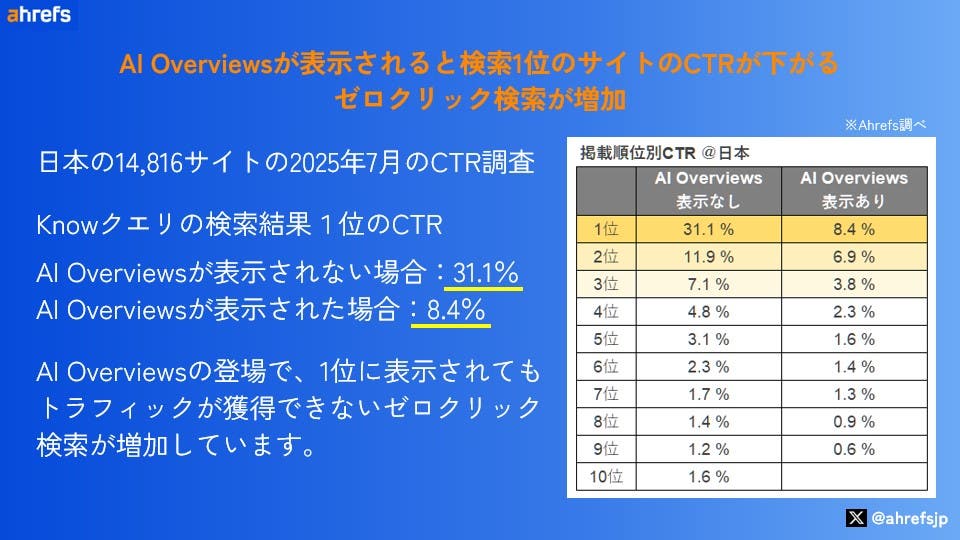 さらに2025年7月の日本市場では、AI Overviewsが表示される検索結果において、検索1位サイトのCTRは大きく下がっていることがわかりました。