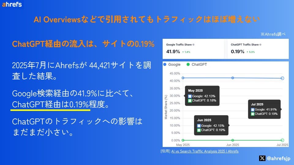 さらに、弊社の分析(2025年5月発表)によると、生成AI経由の流入は 全体の最大で0.9% にとどまり、増加分の平均値は+351セッション程度、中央値は+52セッション程度にすぎません。また、Ahrefsの調査では、ChatGPT経由のトラフィックも2025年5月〜7月で全体のわずか0.19%と、Google検索経由(41.9%)に比べればほぼ無視できる規模です。