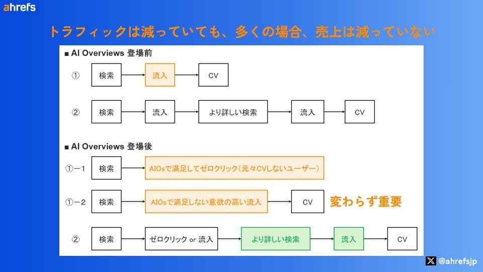 この結果から導き出される仮説は、AI Overviewsで満足してサイトに流入しないユーザーは、「元々コンバージョンしなかった(コンバージョン意欲の低い)ユーザー」であるということです。元々コンバージョンをしていた(コンバージョン意欲の高い)ユーザーについては、依然サイトに流入をしているため、AI Overviewsによるトラフィックの減少ほどコンバージョンが減っていないという結果になっていると思われます。
