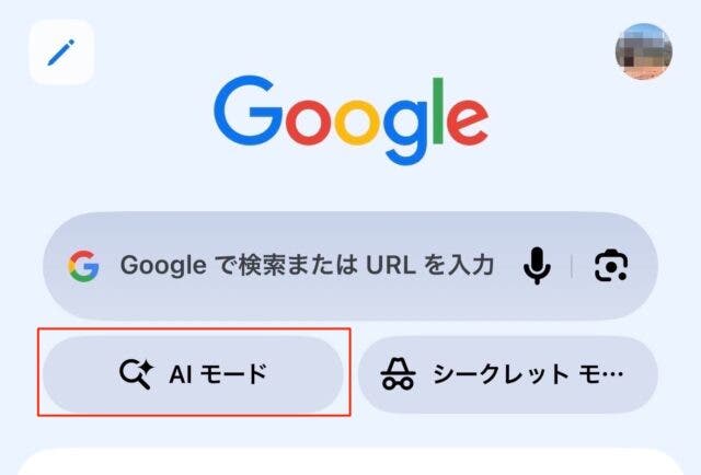 ちなみに、Google Chromeアプリを使用する場合はアプリを開くと、赤枠の箇所にAIモードが配置されています。