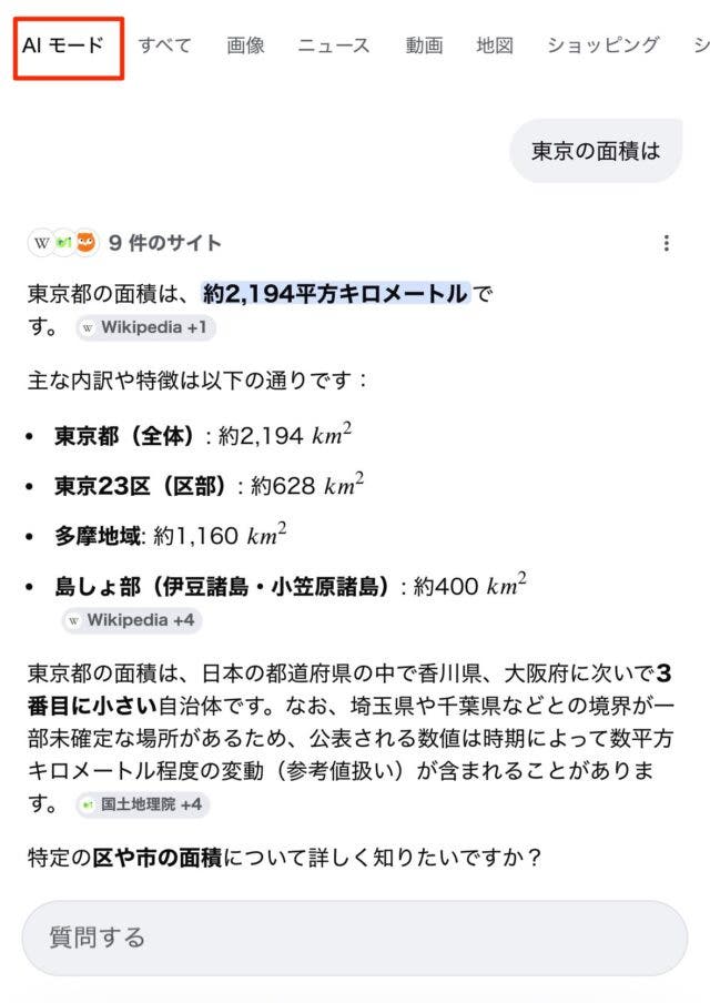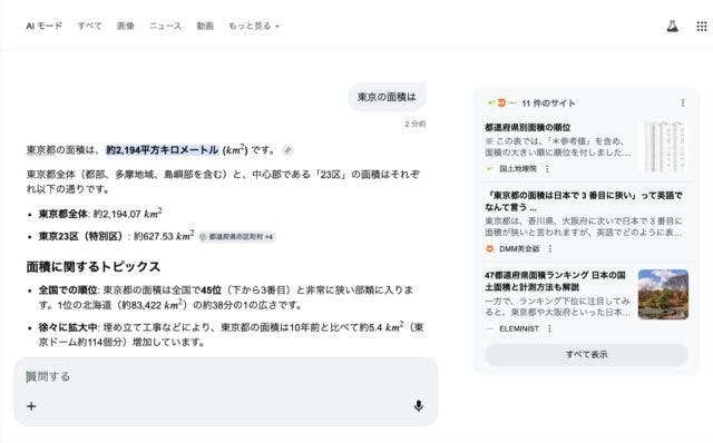 実際にAIモードをクリックした結果、以下のページが表示されました。