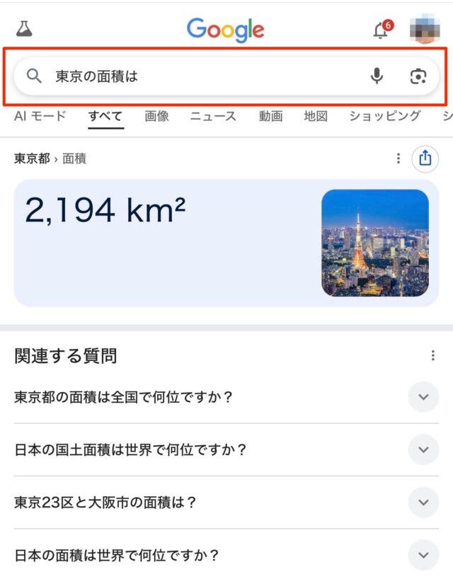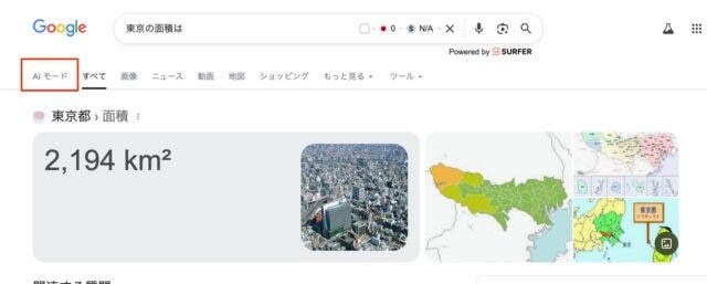 通常通り検索すると以下の画像の赤枠の箇所に「AIモード」タブが表示されます。こちらをクリックすることで、AIモードでの検索結果を表示させることができます。
