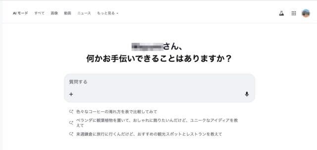 上の画面、検索窓の下にある「AIモード」をクリックすると、以下のような画面が表示されます。