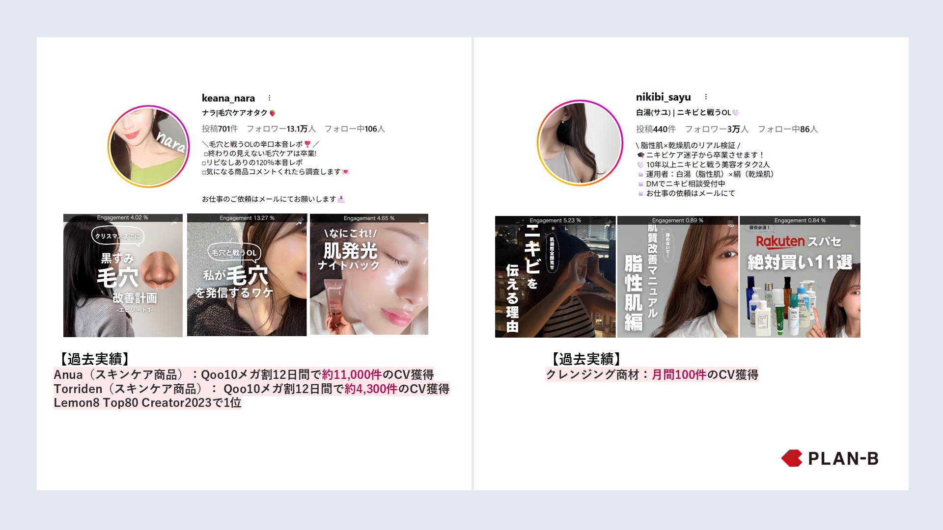 その傍ら、新規顧客の獲得施策についても以前から相談しており、その取り組みの一環としてまずは小規模なPR投稿からサポートいただきました。成果を見ながらPDCAを回し、状況に合わせた改善提案を継続していただいており、その積み重ねの結果として今回のインフルエンサーアフィリエイト施策の実施につながりました。