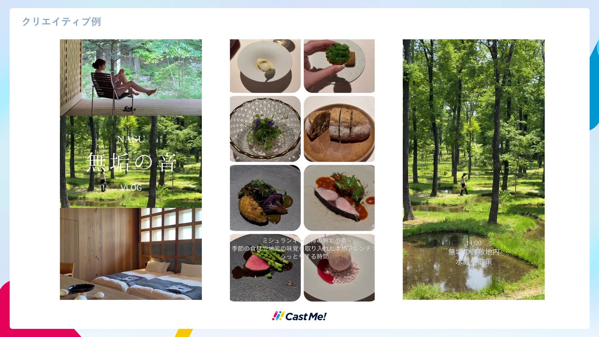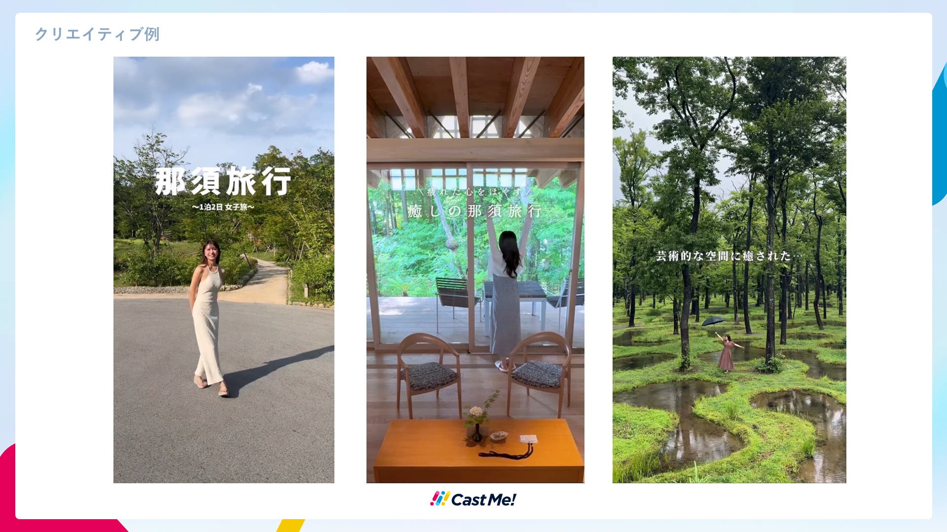 また、「那須旅行」「栃木旅行」といった端的なハッシュタグをつけた投稿も伸びやすい傾向があります。さらに、「次の休みにゆっくり過ごしたい」と考えた時のフックとなるような「ととのい旅」「癒し旅」といったコピーを取り入れたクリエイティブも反響が大きかったです。
