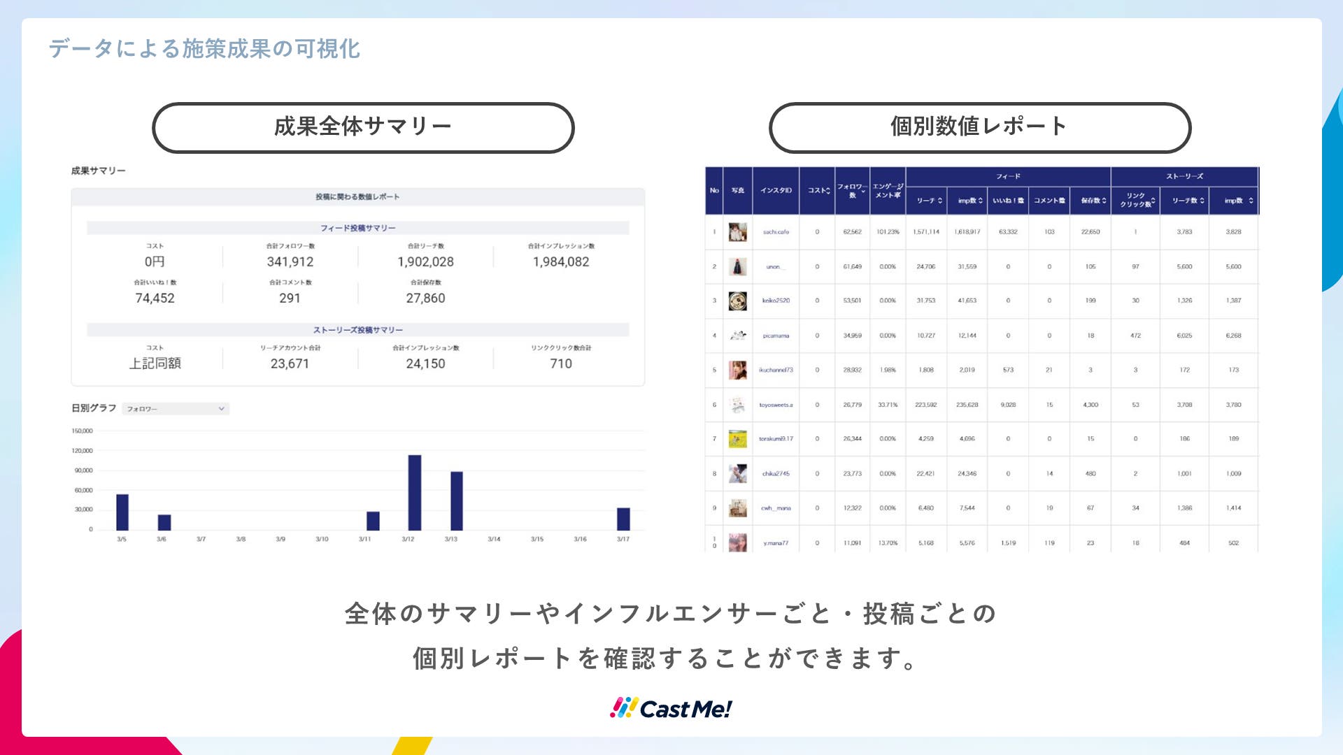 初めてのインフルエンサーPRでどれくらいの反響が出るか見通しが立たない中、コスト面で試しやすかったことは大きな安心材料でした。また、サポートについても他社サービスは問い合わせがサポートセンターに集約され担当者が毎回変わるケースが多いのに対し、Cast Me!は専属担当者が継続的に伴走してくれる体制で、この点が最終的な決め手になりました。