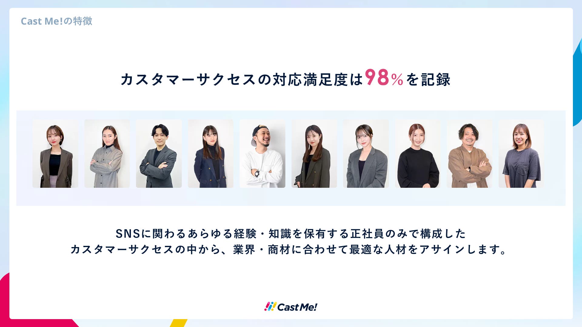 Cast Me! には豊富な実績とSNSの専門的なノウハウを持つコンサルが在籍しており、様々な課題に対しご支援が可能です。是非お気軽にご相談ください!
