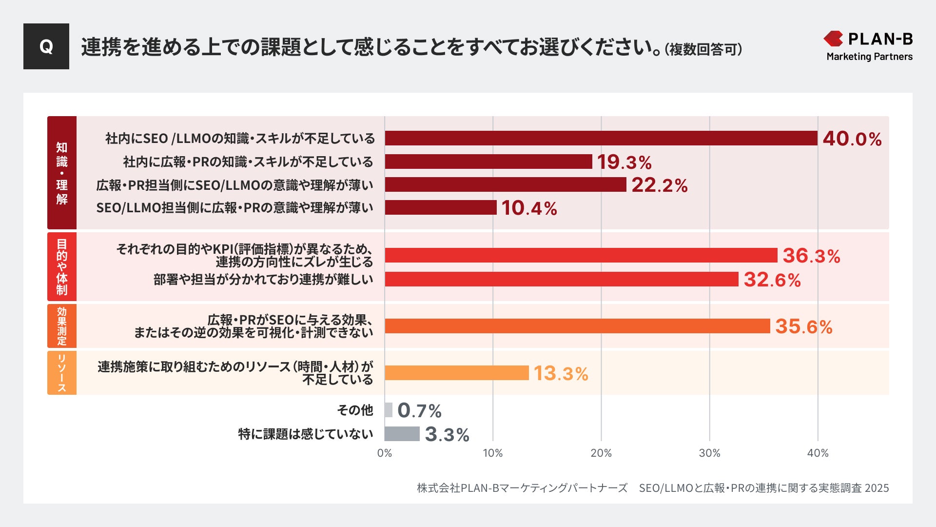次に、前問で連携施策を「実施している」または「今後検討している」と回答した人を対象に、連携を進める上での課題を尋ねたところ、「社内にSEO/LLMOの知識・スキルが不足している」40.0%が最も多く、次いで「KPIの違いによる方向性のズレ」36.3%、「効果を可視化・計測できない」35.6%が上位に挙がりました。体制づくりが進んでいる一方で、担当者の知識の差や評価指標の違いが連携を難しくする要因になっていることが浮き彫りとなりました。