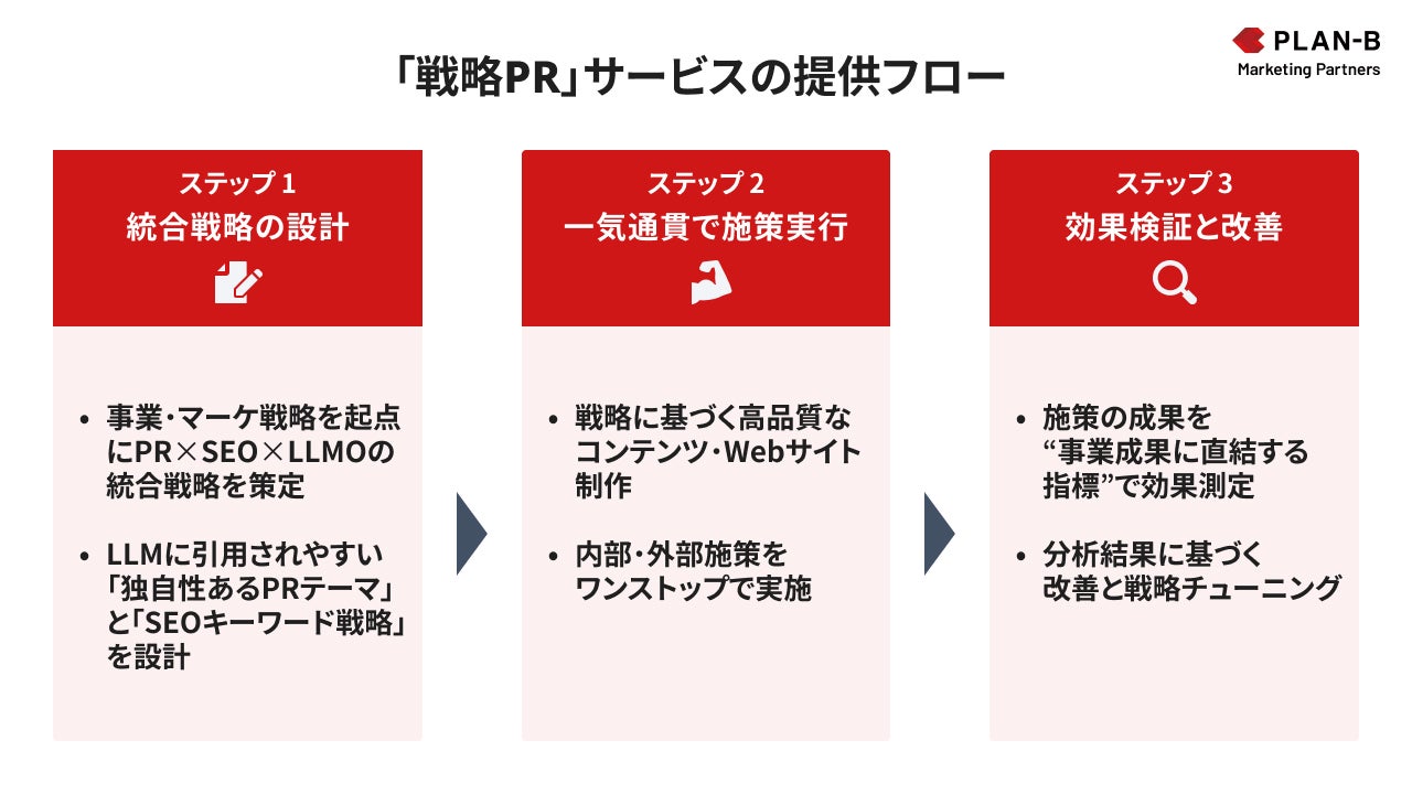 株式会社PLAN-Bマーケティングパートナーズ(本社:東京都品川区、代表取締役:鳥居本 真徳)は、生成AIの普及による検索ユーザーの情報収集プロセスの変化に対応し、企業のマーケティング成果を最大化するための新サービスとして、SEO/LLMOのノウハウを取り入れた戦略的なPRを企画・実行する「戦略PR」サービスの提供を開始します。